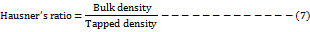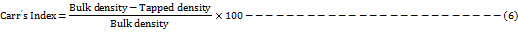 The selected microcapsules formulations were evaluated for various micrometric properties like Carr’s index, the angle of repose and Hausner’s ratio. All the tests were performed as per the procedure is given in USPXXXI. Fixed funnel method was employed to determine the angle of repose (equation-5). For determination of tapped density, microcapsules were tapped using USP tapped density tester (Electrolab, model ETD–1020, Mumbai) for 100 taps and the change in volume was measured [26]. Equation 6 and 7 were used to calculate Carr’s index and Hausner’s ratio respectively.