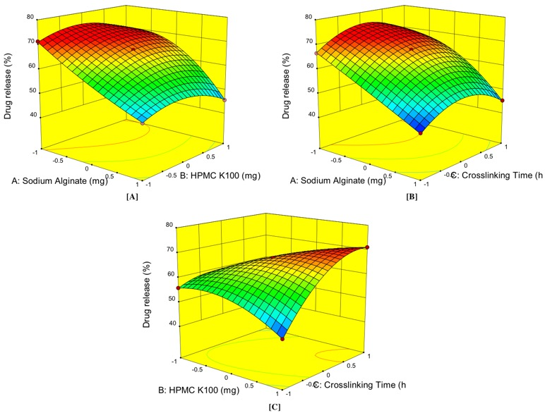 Low level (-1), int. level (0) and high level (+1): Sodium Alginate (mg) 400, 1000 and 1600; HPMC K100M (mg) 100, 250 and 400; Cross linking time (h) 3, 4.5 and 6 and Concentration of CaCl2 (%w/v) 5, 10 and 15