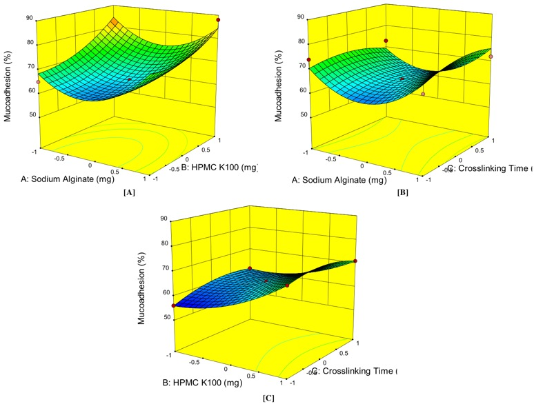 Fig. 4: 3D graph shows the effect of sodium alginate and HPMC K100M on percentage mucoadhesion [A]; sodium alginate and cross-linking time on percentage mucoadhesion [B] and HPMC K100M and cross-linking time on percentage mucoadhesion for the prepared mucoadhesive microcapsules [C]