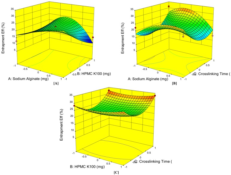 Fig. 5: 3D graph shows the effect of sodium alginate and HPMC K100M on entrapment efficiency [A]; sodium alginate and cross-linking time on entrapment efficiency [B] and HPMC K100M and cross-linking time on entrapment efficiency for the prepared mucoadhesive microcapsules [C]