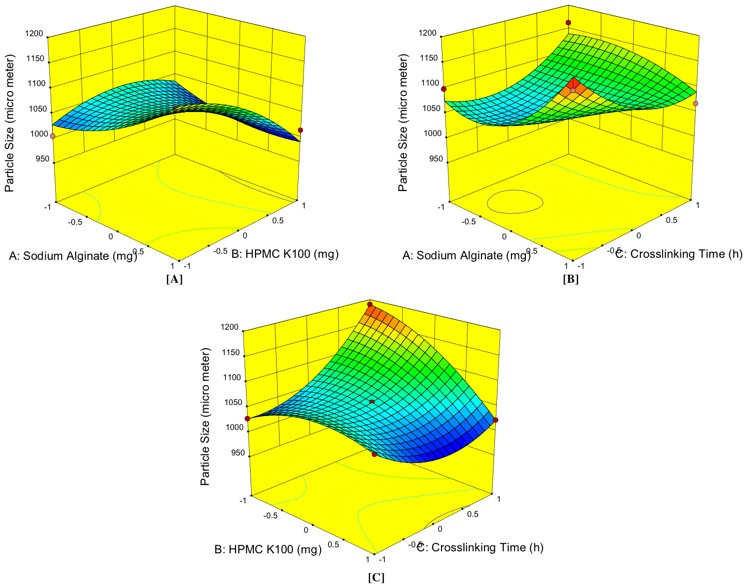 Fig. 6: 3D graph shows the effect of sodium alginate and HPMC K100M on particle size [A]; sodium alginate and cross-linking time on particle size [B] and HPMC K100M and cross-linking time on particle size for the prepared mucoadhesive microcapsules [C]