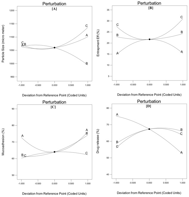Fig. 7: Pertubation plots showing for actual factors on responses such as particle size (µm) [A]; entrapment efficiency (%) [B]; mucoadhesion (%) [C] and percentage in vitro drug release [D]