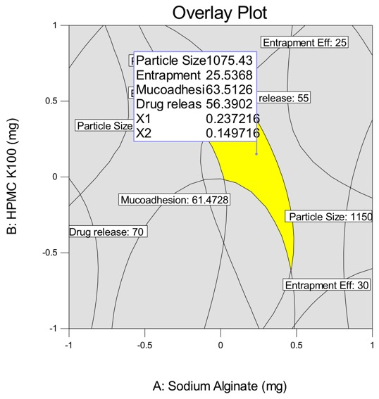 Fig. 8: Overlay plot of factors X1 (sodium alginate) and X2 (HPMC K100M) on responses such as particle size, percentage of drug entrapment efficiency, percentage of mucoadhesion and percentage in vitro drug release