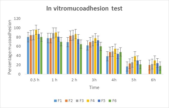 The loose surface crystal study was executed for all the formulations and the results obtained are depicted in table 4. From the study, an initial discharge of ejected medication from the micro-capsules surface (formulation F1 to F6) was observed in the range of 39.99 to 45.95 [23]. In vitro wash-off test (table 4 and fig. 9) summarised the result of mucoadhesive strength or % mucoadhesion in goat intestine mucosa for all the formulations. The adhesion time of microcapsules followed the rank order F4>F5>F3>F2>F6>F1. Results indicated that the viscosity of the polymer was strongly associated with the adhesion. Viscosity was directly proportional to the mucoadhesive property. Unlike others, the microcapsules formulated with sodium alginate as one of the ingredients unveiled superior mucoadhesive property as in the case of in vitro wash-off test. A quicker wash off was observed in phosphate buffer (pH 6.8), since pH of the medium governs the hydration, solubility and mucoadhesive of the polymers. Ionisation of carboxylic acid or other functional groups on the polymers may be one of the reasons for increased solubility and reduced adhesive strength that attributes to rapid wash off. The results of the wash-off test specified that formulation F4 showed maximum mucoadhesion. This might be due to high molecular weight, linear, unbranched structure and viscosity of HPMC K100M as on enhancing agent in selected medium [24].
