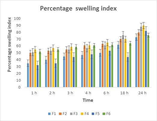 Mucoadhesive microcapsules are expected to possess considerably stronger adhesion due to more water uptake from the underlying mucosal tissue by absorbing, swelling and capillary effects. From the calculated data, the swelling index for the formulations were found to be in the range of F4>F3>F5>F2>F6>F1 (fig. 10). After 24h, HPMC K100M showed highest swelling (90%) for formulation F4.