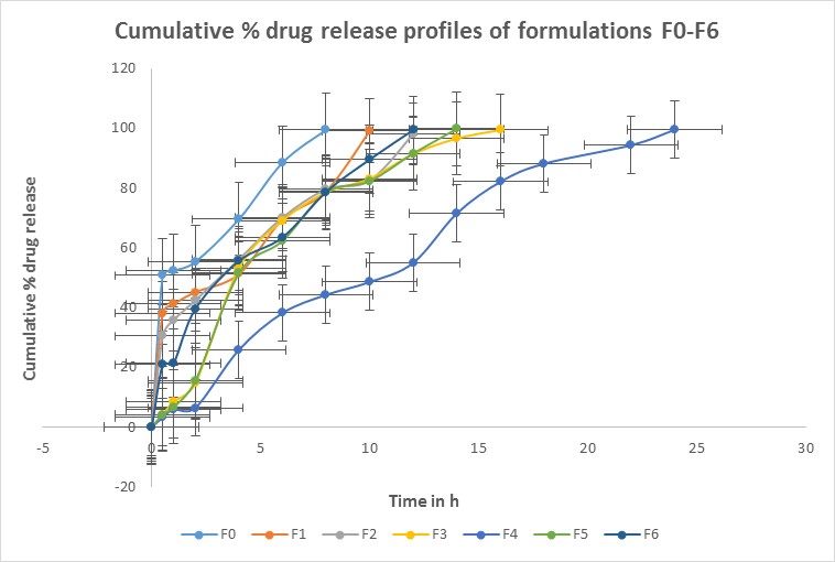 Fig. 11: Cumulative % drug release profiles of formulations F0-F6, Each reading is an average of three determinations (mean±SD (n=3) n=no. of observation