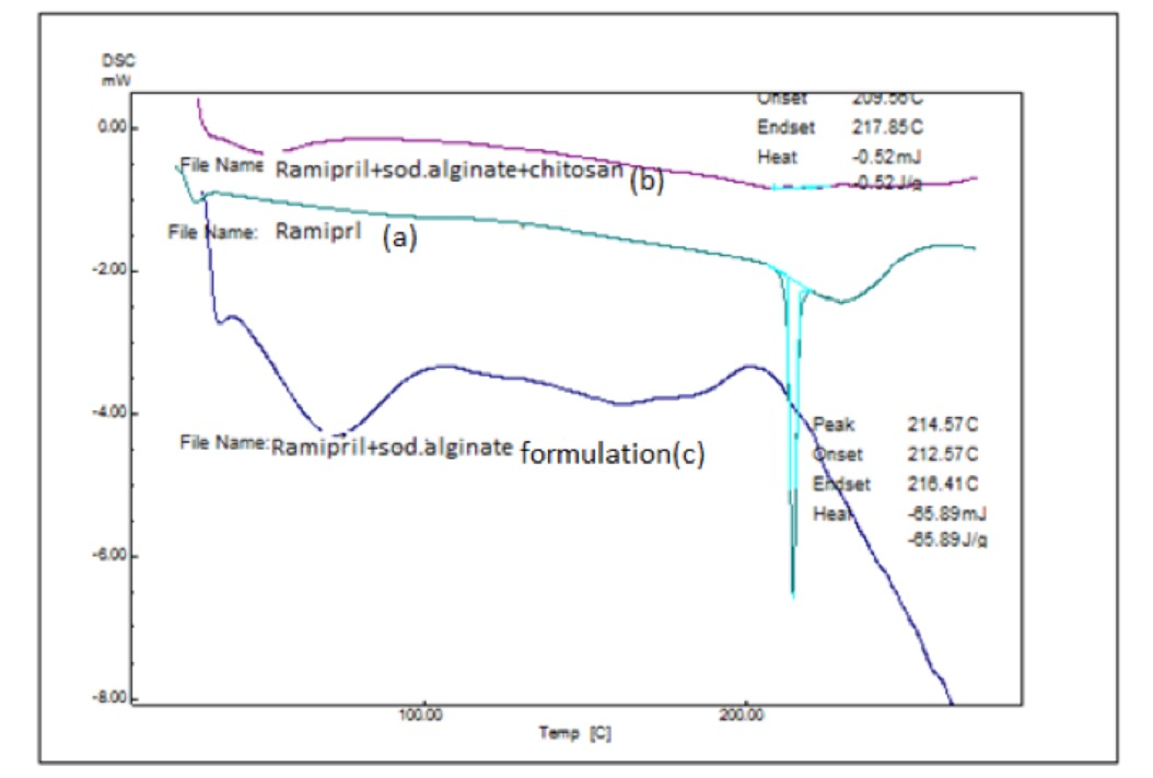 Fig. 13: DSC graphs of ramipril [a], optimized formulation [b] and pure drug+sodium alginate+HPMC K100M (physical mixture) [c]
