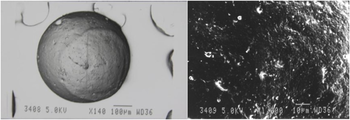 The sphericity of all formulations from F1 to F6 ranged from 0.59±0.23 to 1.0±0.23 as shown in table 4. The ramipril-loaded microcapsules obtained had a circulatory factor very close to 1.00 confirming their sphericity. Overall all the formulations were spherical in appearance. Further, the optimised formulation was confirmed by SEM study [27].