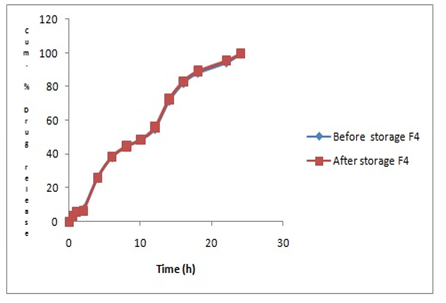 Short-term stability studies as per ICH guidelines were carried out for the optimised formulation (F4). The drug content and cumulative % drug released were tabularized in table 7. After 3 mo stability study, it was seen that at selective relative humidity with higher temperature optimised formulation are stable based on the obtained percentage drug content and percentage drug release data, hence the formulation was stable (fig. 15) [31].