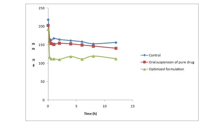Oral administration of ramipril suspension and optimised formulation revealed a significant decrease into mean systolic BP. Whereas in case of control group, mean systolic BP was constant throughout the study period with minimum BP was recorded to be 156.31 mm of Hg at 12 h (table 8), while in treatment group received the oral suspension of ramipril observed reduction of mean systolic BP to 153.41 mm of Hg after 0.5 h and 154.18 mm of Hg in 2 h. However administration of the optimized formulation of ramipril observed a significant reduction in mean systolic BP to 112.16 of Hg after 0.5 h and 110.21 mm of Hg in 2 h i.e., animals reach to normotensive state due to faster onset of action attributed by enhanced bioavailability potential of mucoadhesive formulations (fig. 16) [32].