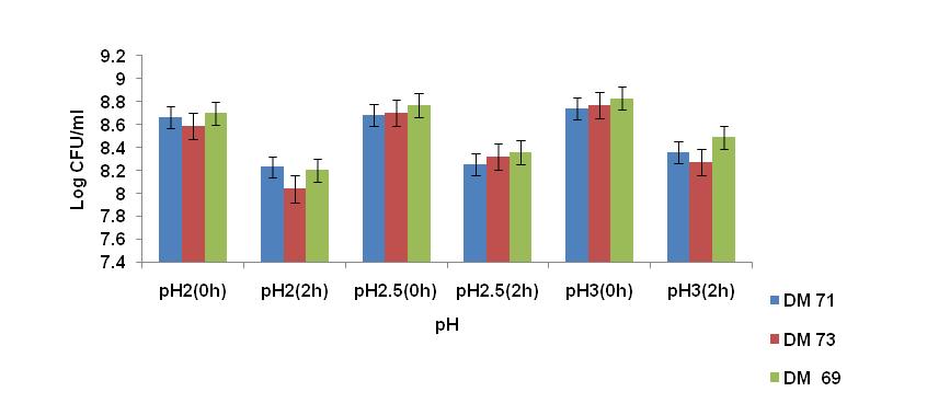 Fig. 1: Acid tolerance capability of isolated Lactobacillus: viability (log CFU/ml) of all 3 probiotic strains (DM71, DM73 and DM69) with respect to pH2-3 till 2 h. The results are the means of 3 independent experiments and the bars correspond to standard deviations (P<0.05)