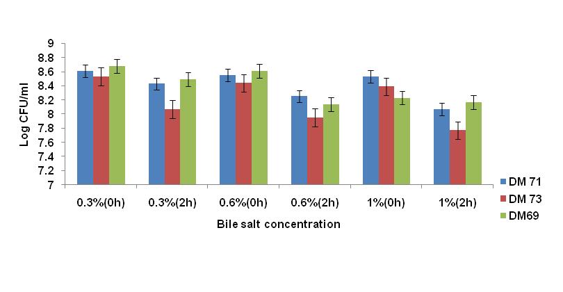 Fig. 2: Bile salt tolerance test: viability (log CFU/ml) of probiotic strains (DM71, DM73 and DM69) with respect to various bile salt concentrations (0.35, 0.6% and 1%). The results are the means of 3 independent experiments and the bars correspond to standard deviations (P<0.05)