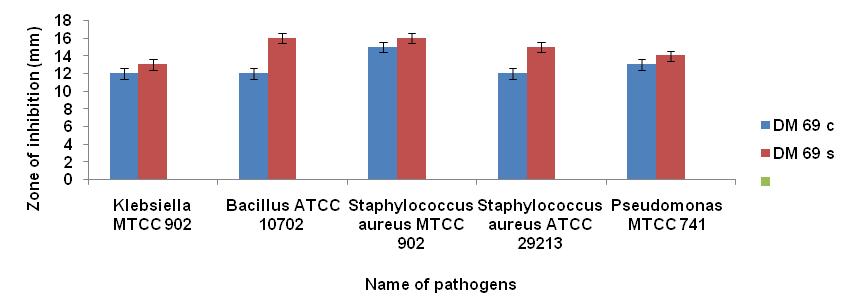 Fig. 3: Zones of inhibition shown by both whole cell (c) DM69 and its CFS (s) against several pathogens. The results are the means of 3 independent experiments and the bars correspond to standard deviations (P<0.05)