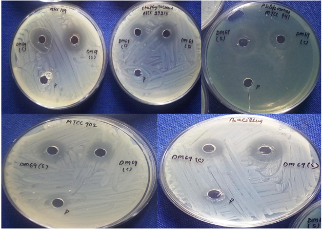 The present investigation also highlights the antipathogenic effect of DM 69 against Gram-positive and Gram-negative bacteria. Out of all three probiotic strains, the whole cell of DM69 and its cell-free supernatant had antagonistic property towards Bacillus cereus ATCC 10702, Staphylococcus aureus subsp. aureus ATCC 29213, Staphylococcus aureus MTCC 902, Pseudomonas aeruginosa MTCC 741 and Klebsiella pneumonia MTCC 109. It was mainly indicated the presence of an extracellular antimicrobial compound in potent probiotic DM69. The diameter of inhibition zones in well diffusion method was greater than 10 mm (fig. 3, 4). This result was in agreement with several previous studies [15]. ANOVA test revealed that a highly significant variation of the zone of inhibition values was observed among all the isolates (P<0.05) against pathogens.