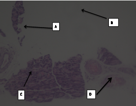 Fig 4: Slides of pancreas of different treated groups: (1- Normal Control; 2-Diabetic control; 3-Standard; 4-Test I; 5-Test II; 6-Test III) A- Massive cell damage; B- extensive destruction of cell lining; C- inflammatory cells; D- β-cell damage