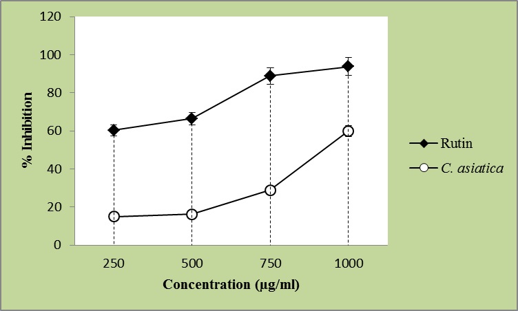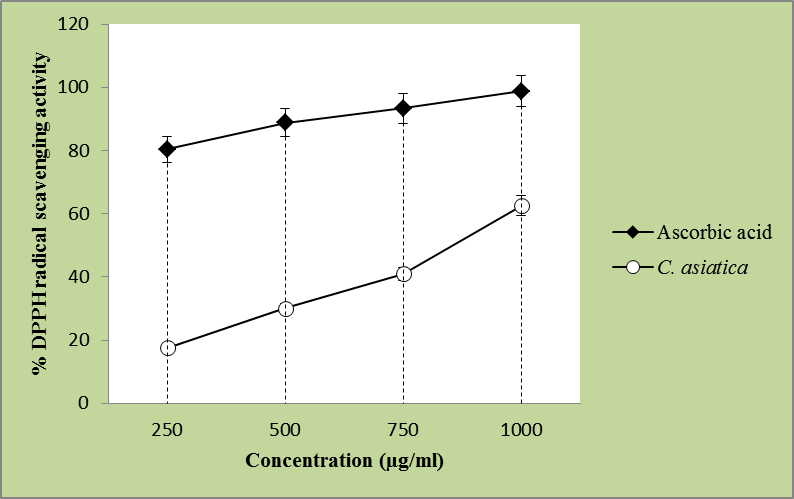 Fig. 1: DPPH radical scavenging activity amylase of hydroalcoholic extract of C. asiatica. Data are expressed as means±SD (n = 3)