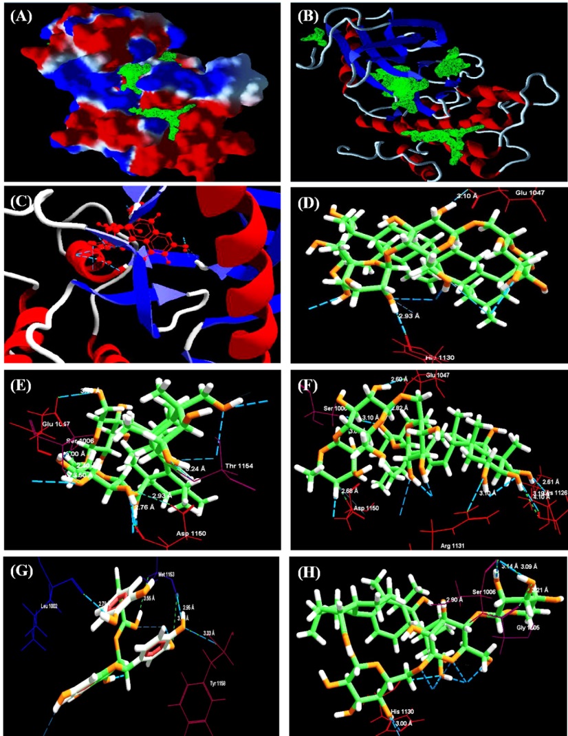 Fig. 5: Docking interaction of different constituents of C. asiatica on active site of 1IR3 PDB. A-protein surface; B-secondary structure of 1IR3 protein; C-secondary protein structure with interacting molecule; D-H depicts interaction of centellasaponin-C, asiaticoside, siaticoside-E, castilliferol and brahminoside with 1IR3 PDB respectively