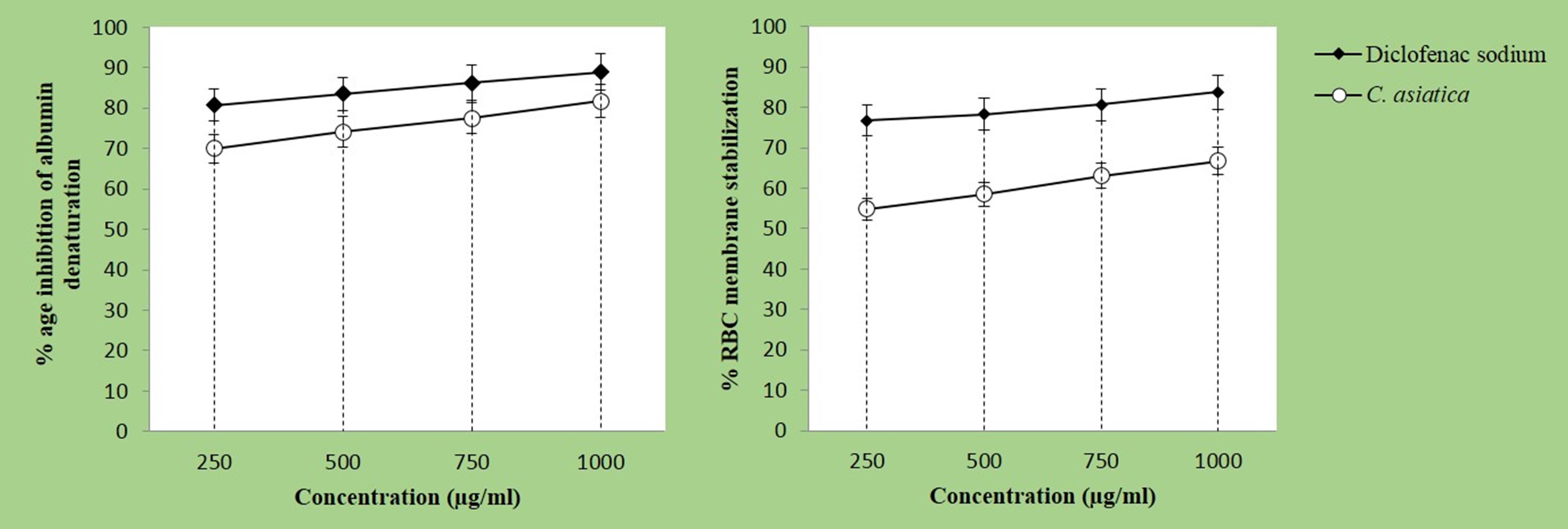 Fig. 2: % inhibition of protein denaturation (a) and % RBC membrane stabilization (b) activity of hydroalcoholic extract of C. asiatica. Data are expressed as means±SD (n = 3)