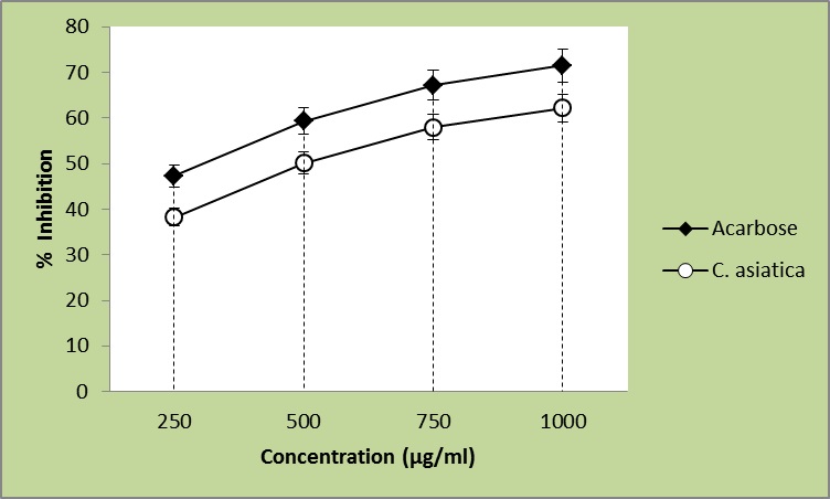 Fig. 4: α-glucosidase inhibitory assay of hydroalcoholic extract of C. asiatica. Data are expressed as means±SD (n = 3)