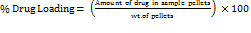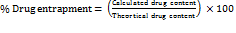 Drug loading is important with regard to release characteristics. Generally, increased drug loading leads to an acceleration of the drug release. Drug entrapment efficiency represents the proportion of the initial amount of drug, which has been incorporated into the spheroids. To assess the entrapment efficiency, specific amount of crushed spheroids were suspended in 100 ml of pH 7.2 phosphate buffer with constant agitation at room temperature for 24 h. Finally, the solution was filtered through Whatman filter paper, drug content was determined spectrophotometrically, at the wavelength of 379 nm using 7.2 pH phosphate buffer as blank. The entrapment efficiencywas calculated by using the Eq. (5):