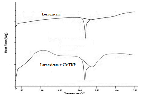 DSC studies were carried out for lornoxicam and its combination with polymers in 1:1 ratio and the thermograms obtained are presented in Fig. 3. From the thermograms it was evident that decomposition temperature of lornoxicam (218.74 °C) was not changed when a mixed with excipients (219.79 °C)showen in Fig. 3. Hence, it may be inferred that there is no interaction between lornoxicam and polymers used in the preparation of pellets.