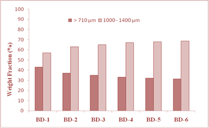 Drug loading and encapsulation efficiency of the spheroids are given in Table 4. Drug loading among all formulations were in the range of 19.59±1.12 - 22.39±0.39%. Drug loading was found to be the least in formulation BD-4and highest in formulation BD-1. The entrapment efficiency of formulation BD-3 (96.09±0.21%) was found to be highest among all formulations. The extent of drug loading appears to influence the particle size distribution of spheroids. When the drug loading is high, the proportion of larger size particles formed are also high.The weight distribution of the different pellet formulation is presented in Fig. 4, indicating the pellet yield (710-1400 µm fraction), in different size range.