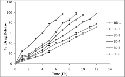 From the in vitro release data, it was found that formulations BD-1, BD-2 and BD-3 containing CMTKP in concentration 2.5% w/w, 5% w/w and 7.5% w/w released 97.20±1.5%, 79.35±1.7% and 66.89±1.4% of drug at the end of 7 h study, indicating that the polymer in each formulation was insufficient to sustain the drug release. The release of drug from the BD-4 batch prepared with 10% w/w CMTKP concentration was extremely significant in comparison to other batches. The amount of drug released at the end of 12 h was found to be 98.13±0.9%.This might be due to higher concentration of the CMTKP, which may be attributed to slower penetration of dissolution medium in the matrices.