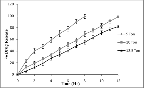 These factors can be changed by altering the compression force. It was shown during the dissolution studies. The different characteristics of compressed tablets are given in Table 5. The hardness was found to increase with increase in compression force it was in order 5 Ton < 10 Ton < 12.5 Ton. The friability and weight variation tests were also within pharmacopoeial limits.