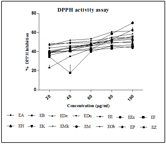 DPPH is nitrogen-centered, stable free radical, which can get readily destroyed by free radical quencher and shows a strong absorption band at 517 nm. The decrease in optical density of plant samples indicates its antioxidant activity [25]. Results revealed that EE and EM extracts had (IC 50 value of 32±0.5, 57.2±0.9 respectively) highest ability to scavenge DPPH free radical than other Eulophia species (fig. 1). These results suggest that EE and EM contain more hydrogen donor compounds to free radicals, which removes an odd electron.
