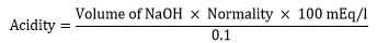 An aliquot of 1 ml of gastric juice diluted with 1 ml distilled water was taken in a conical flask and titrated against 0. 01N NaOH with phenolphthalein as an indicator till a permanent pink color is obtained [45]. The volume of NaOH was then noted. The total acidity, expressed as mEq/l was then calculated using the following formula: