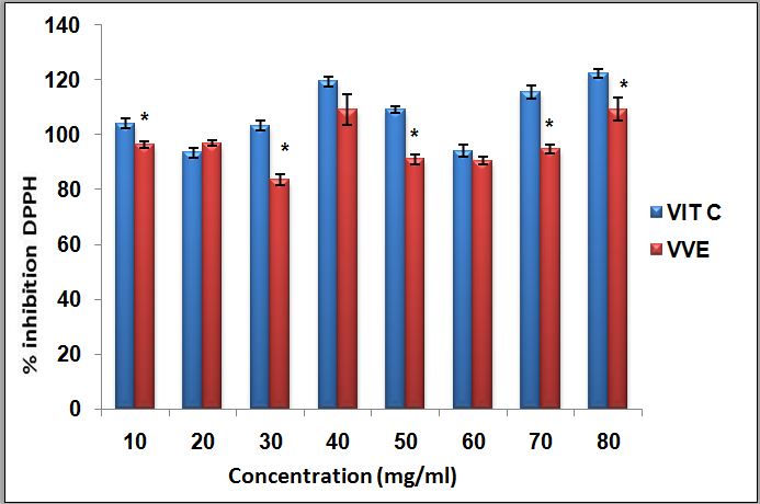The results of DPPH scavenging activity of VVE and ascorbic acid were shown in fig. 1. The radical scavenging activity was estimated by comparing the percentage of DPPH radical inhibition of the tested extract and the ascorbic acid. The present results showed that VVE produced dose-dependent inhibition of DPPH radical ranging from 96.4% to 109.3% as compared to vitamin C.