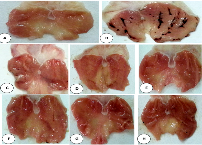 Administration of indomethacin (150 mg/kg body weight) and cold-restraint stress caused a severe gastric ulcer (SGU) covering the entire glandular area of the stomach (fig. 2B). In SGU linear hemorrhagic lesions were seen as red streak lesions. Pre or post-treatment with VVE and/or RAN showed the significant healing effect of the gastric lesions (fig. 2C-H).
