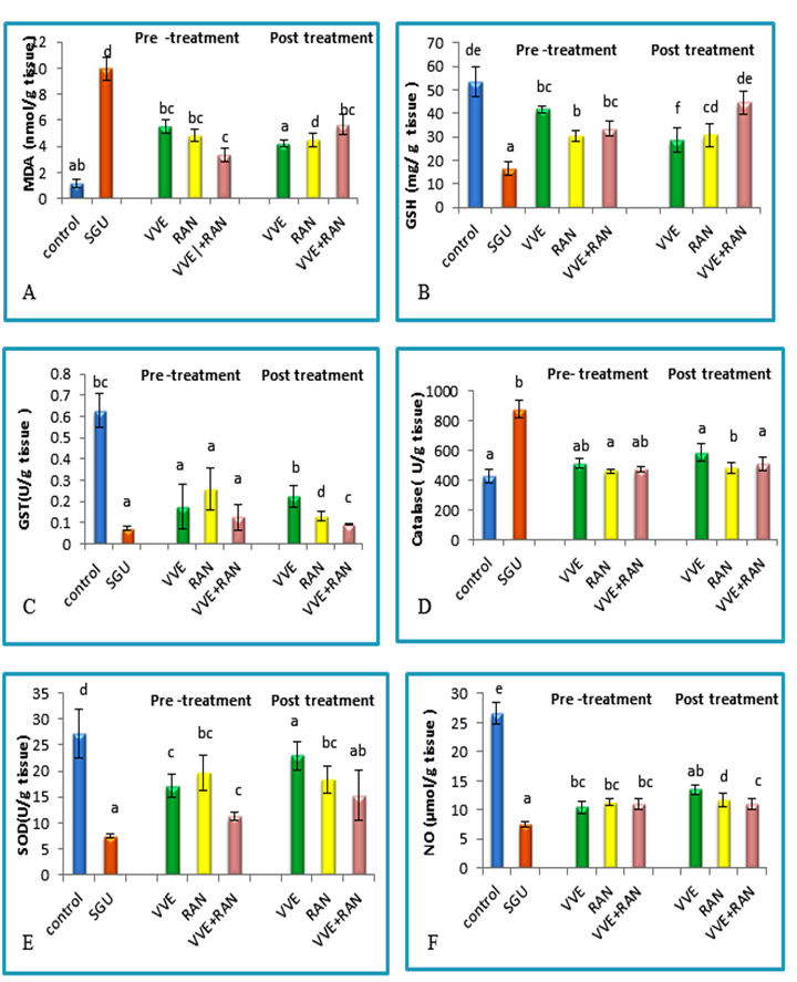 Results recorded in table 3and4 and Fig. 3B, C and E showed that SGU induction significantly decreased (P<0.05) GSH, GST and SOD levels, as compared to the control rats in both stomach and duodenum. Pre or post-treatment with VVE, RAN and VVE+RAN significantly increased (P<0.05) the gastric and duodenal GSH, GST and SOD levels, as compared to the corresponding SGU group.
