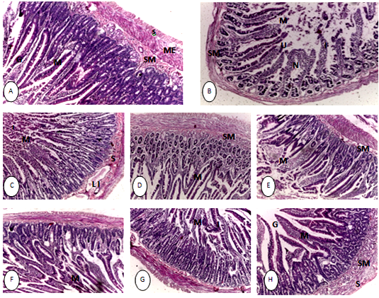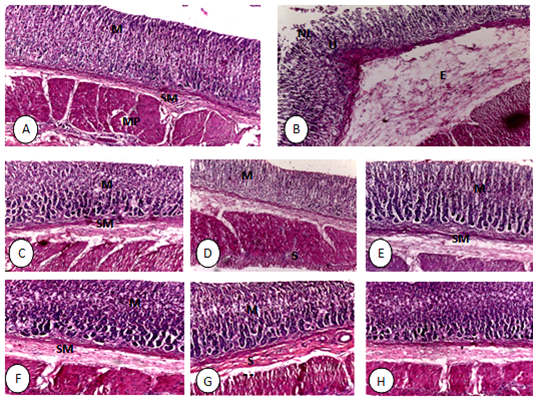 In contrast, the post-treated rats have great improvement in their duodenal histological architecture; duodenum sections showed more compact mucosa in VVE, RAN and VVE+RAN with mild inflammatory cell infiltration in mucosal epithelial after treatment with VVE (fig. 5F) and RAN (fig. 5G). However, VVE+RAN sections showed nearly normal mucosa and submucosa (fig. 5H).