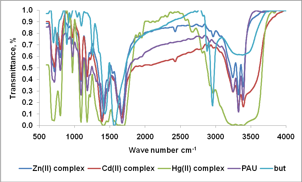Fig. 1: IR spectra of Zn(II), Cd(II) and Hg(II) complexes, PAU and but ligands