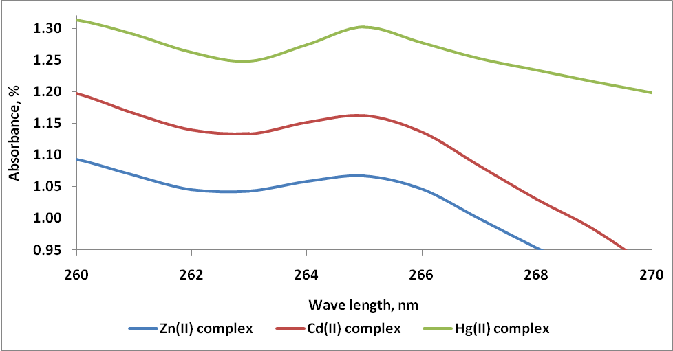 UV absorption frequencies obtained ~265 nm for all the three Zn(II), Cd(II) and Hg(II) complexes indicate that charge transfer transition. The UV spectra of the complexes are given in fig.2.