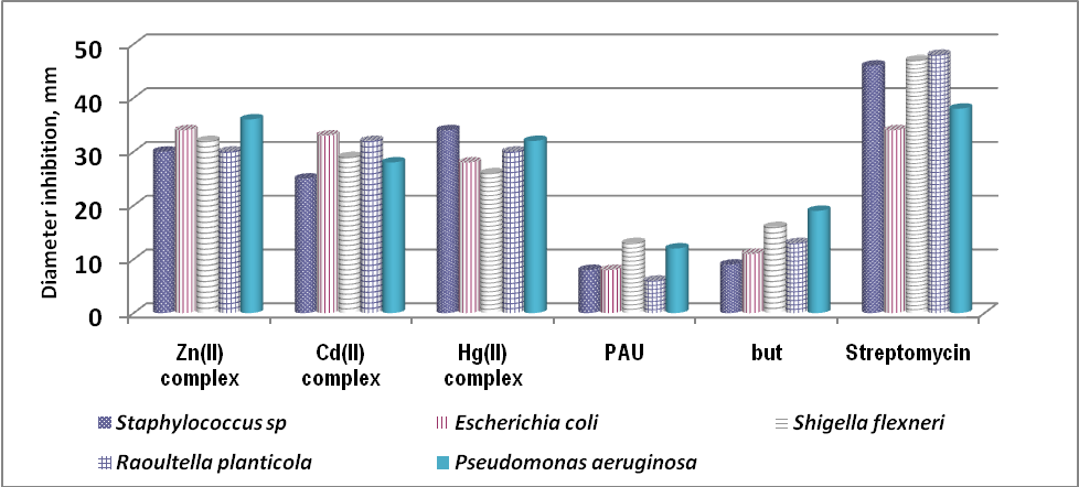All the three complexes exhibit enhanced antibacterial activity[18] than the pure ligands. Streptomycin was used as standard reference. [Zn(PAU)but)2] exhibits higher activity than [Cd(PAU)but)2] and [Hg(PAU)but)2].