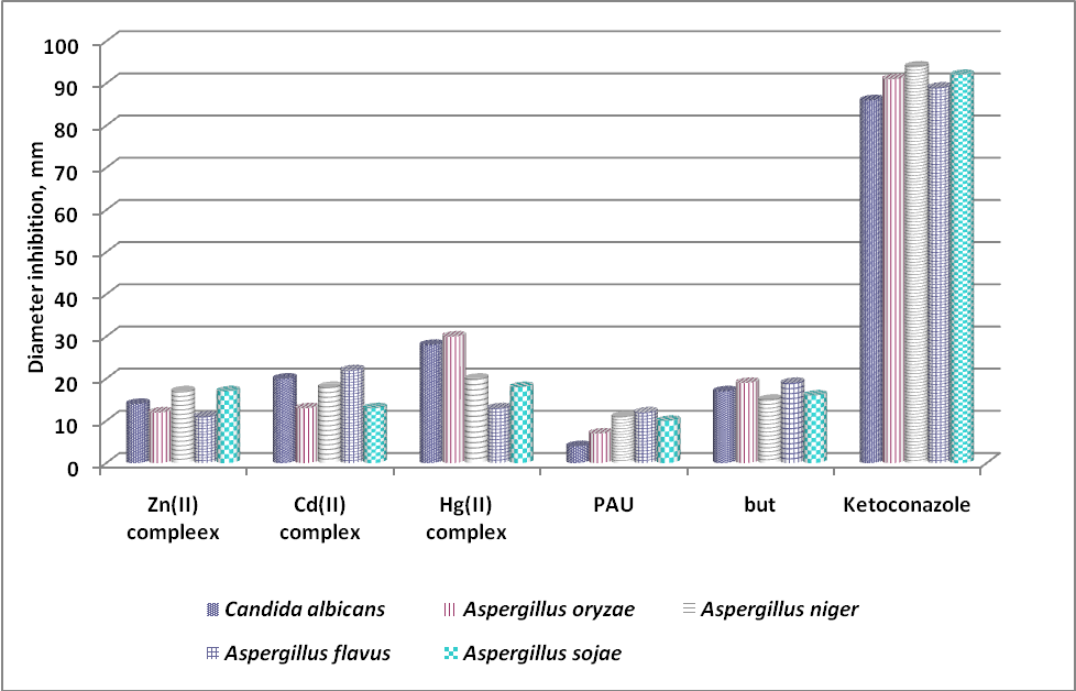 All complexes show lower anti fungal activity[19] than the standard, ketoconazole. [Hg(PAU)(but)2] exhibits higher anti fungal activity than [Zn(PAU)(but)2] and [Cd(PAU)(but)2]. The anti fungal activity of PAU is less than sodium butanoate. The anti fungal activities of Hg(II) complex against Staphylococcus sp. and Escherichia coli are higher than those of Zn(II) and Cd(II) complexes. However, the anti fungal activity of the standard, ketokonazole is much higher than the three complexes. The mean diameter inhibition in mm at 400µg/ml is represented in table 3 and in fig.4.