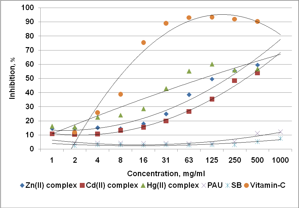 at a concentration of 1000 µg/ml than the standard, Vitamin-C. The inhibition percentage of Zn(II), Cd(II) and Hg(II) complexes are 44.13, 36.25 and 34.68 respectively. The inhibition percentage at various concentrations of complexes and ligands are given in Table 4 and in fig.5.