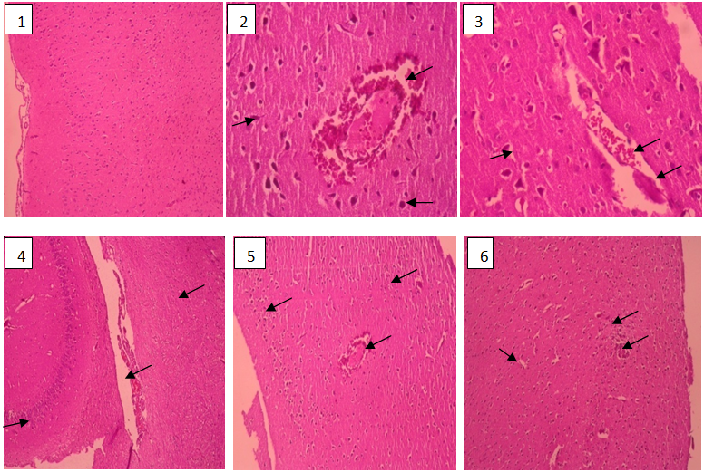 No change was found in histo-architecture of the brain in control group fig. 1. Bilateral carotid artery occlusion induced cerebral ischemia in rats showed marked cerebral edema, moderate cerebral congestion, neuronal vacuolization, mild neutrophilic Infiltration fig. 1(2). Ischemia followed by reperfusion group showed moderate cerebral edema, marked cerebral congestion, moderate neuronal vacuolization and mild neutrophilic infiltration fig. 1(3). Pretreatment with piracetam showed mild cerebral edema, cerebral congestion and mild neutrophilic infiltration fig. 1(4). Pretreatment with vanadyl sulfate showed moderate cerebral edema, cerebral congestion and mild neutrophilic infiltration fig. 1(5). Pretreatment with piracetam and vanadyl sulfate showed mild cerebral edema, cerebral congestion and focal neutrophilic infiltration fig. 1(6).