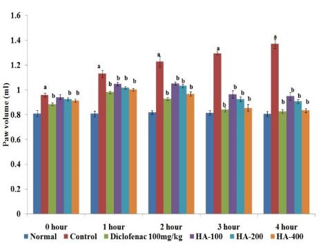 Fig.1: It shows the effect of HA extract of Litchi chinensis Gaertn. leaves on carrageenan induced paw edema in rats. The data obtained from various groups were statistically analyzed using one-way ANOVA followed by Tukey’s Multiple Range Test. p<0.05, is considered statistically significant. a: vs normal; b: vs control