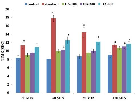 Fig. 2: It shows the effect of HA extract of Litchi chinensis Gaertn. leaves in Hot Plate Test. The data obtained from various groups were statistically analyzed using one-way ANOVA followed by Tukey’s Multiple Range Test. p<0.05, is considered statistically significant. a: vs control.