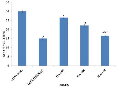 Fig. 3: It shows the effect of HA extract of Litchi chinensis Gaertn. leaves in acetic acid induced writhing method.