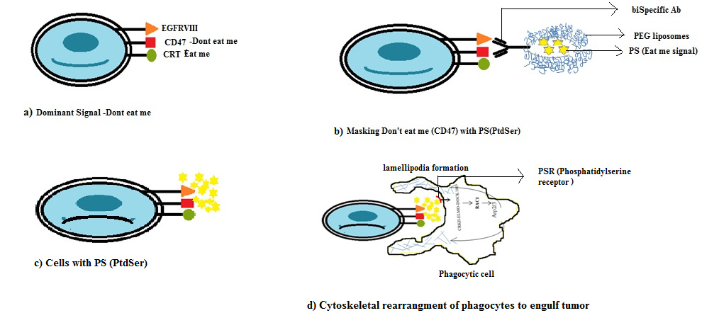 (a). CD47 (antiphagocytic signal), and Calreticulin (CRT-pro phagocytic signal) both present on tumor cell surface, (b). bispecific antibody conjugated with PEG liposomes are targeting CD47 and EGFR VIII, (c). Desorbing PEG liposomes lead to adding of pro-phagocytic signal (PtdSer) over CD47, which masks CD47 presence in tumor cell surface, (d). Phagocytic cell undergoes cytoskeletal rearrangement after binding with PtdSer and CRT to engulf CD47 masked tumor cell