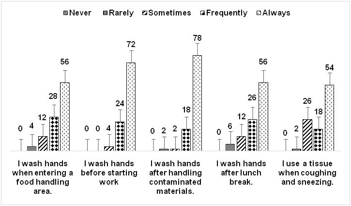 It was brought out in this study when 94% of the respondents concurred that they must have short fingernails, clean, no 'varnish' or wearing artificial nails. Also in attitudes of hand hygiene, where a majority of them always wash hands before starting work (72%) and after handling contaminated materials (78%) has been presented in fig. 2. However, moderately did always wash hands when entering a food handling area (56%), after the lunch break (56%) and use a tissue when coughing and sneezing (54%). In the previous study done by Clayton et al. [30], food handlers might be mindful of the food hygiene attitudes they should have, but 63% of their respondents admitted that they seldom use such positive attitudes. Therefore, food handlers need to think hygiene attitudes are crucial to be meshed in this arena.