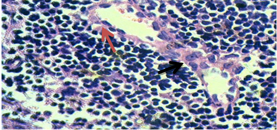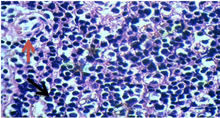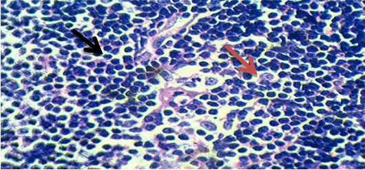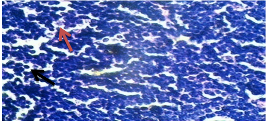 The lymphocytes of the medulla are larger but abundant, and the integrity of cells is maintained with very few necrotized cells (red arrow), normal cells (black arrow) in fig. 5.