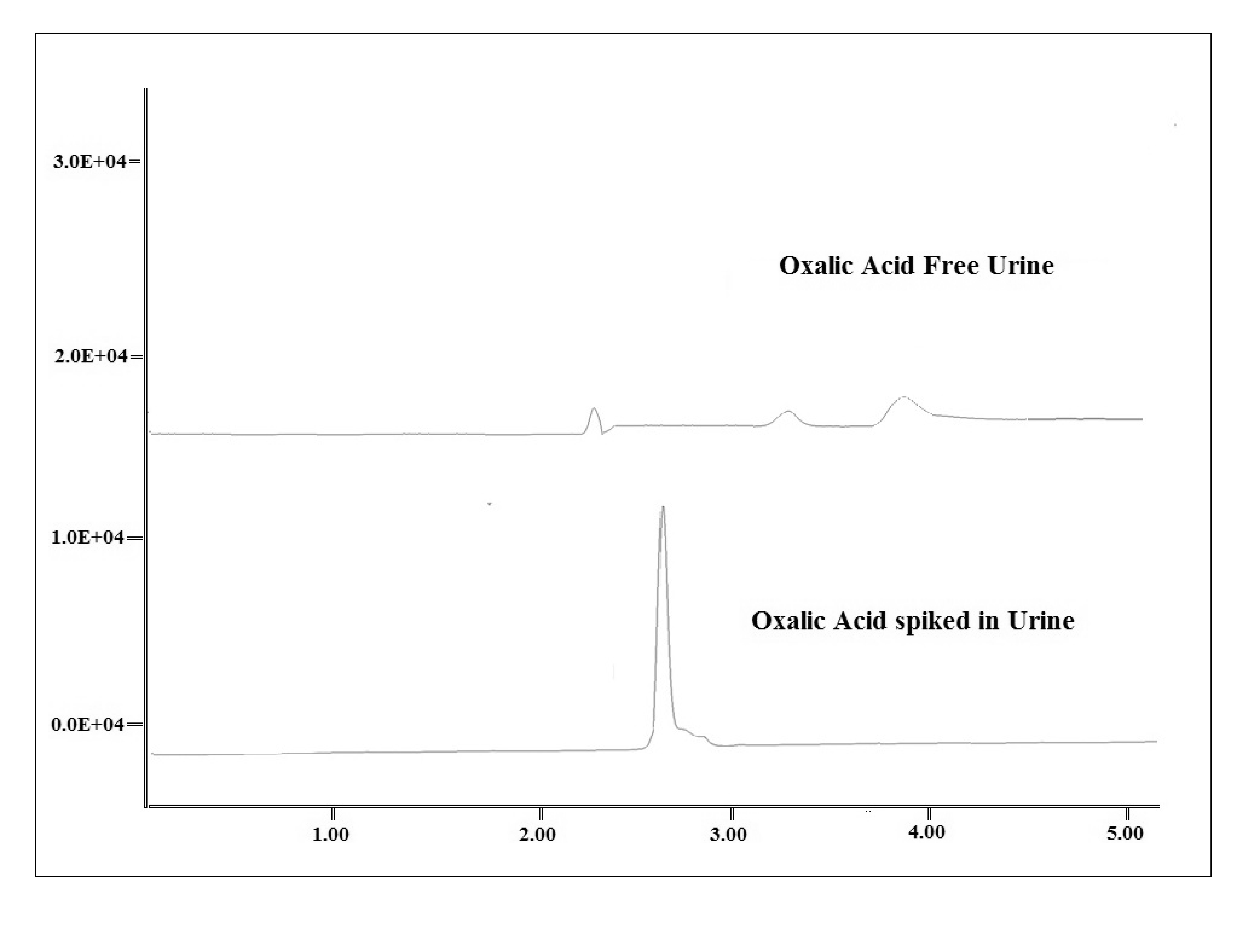 The retention time for the investigated oxalic acid was found to be different than that of endogenous urine components. Thus, it indicates selectivity of a method for elution of oxalic acid in urine.