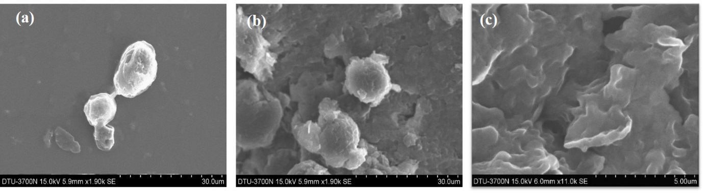Fig. 1: Scanning electron micrograph (SEM) of formulated SLNs (a), D-SLNs after incubation period (b) and morphological examination of D-SLNs at higher magnification