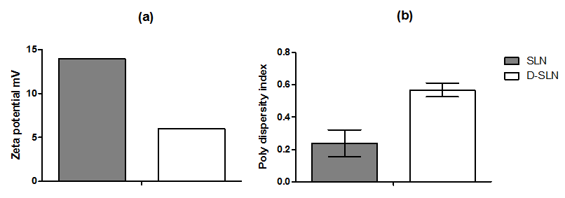 Fig. 4: Physicochemical investigation of SLNs and D-SLNs; (a) zeta potential and (b) polydispersity index