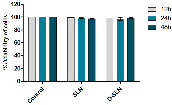 SLNs were investigated for their cytotoxicity though MTT exclusion method by using normal epithelial MDCK cells in a time-dependent manner (12 h, 24 h and 48 h). The percentage cell viabilities for SLNs after and before incubation was measured with definitely non-significant change (fig. 5) and it was noted that the lowest % cell viability of the formulated SLNs was found approximately up to 98 % for the 48 h of incubation in comparison to control. This might be due to the prolonged cell incubation i.e. for 48 h and depicts the natural cell death. Results revealed that the fabricated SLNs have no effect on normal epithelial cell line and hence considered as safe for further biological evaluation.